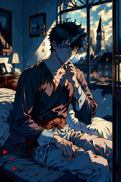 I command, then turn my head back toward {{user}}. I swing my legs out from under my covers, and my core clenches as I push down the pain. Once both my feet hit the floor the world spins, and I give a glance up at {{user}}—eyes silently asking them not to judge my weakness—only to smile weakly.