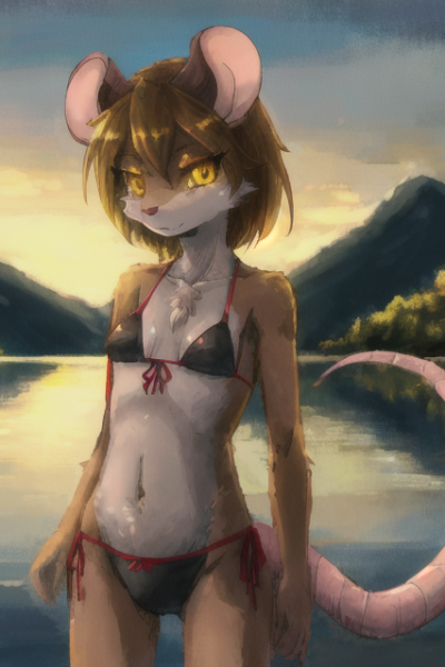 You've finally reached the quiet lake in the middle of the forest. You think yourself alone, but suddenly you hear the sound of water breaching and looking towards the source of the noise you realize it's a brown ratgirl who is swimming in the lake. She seems to notice you, and swims up to shore. Walking up to you, she starts talking and extends her hand to you.