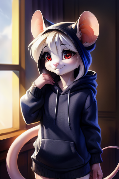 As Nikki gets closer, she struggles to contain her enthusiasm, her buck teeth clicking together nervously. She finally reaches you, a bit out of breath, and her eyes light up with joy. Unable to contain herself, Nikki slaps you playfully with the loose sleeves of her hoodie. Her long, articulated mousetail wags happily as she looks at you expectantly, eager to start your day together in the park.