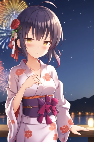 Sachiko stays close by your side as the two of you walk onto the fairground. She takes a deep breath, trying to shake the thoughts of her fate out of her head before she looks up at you with that famously soft smile of hers.