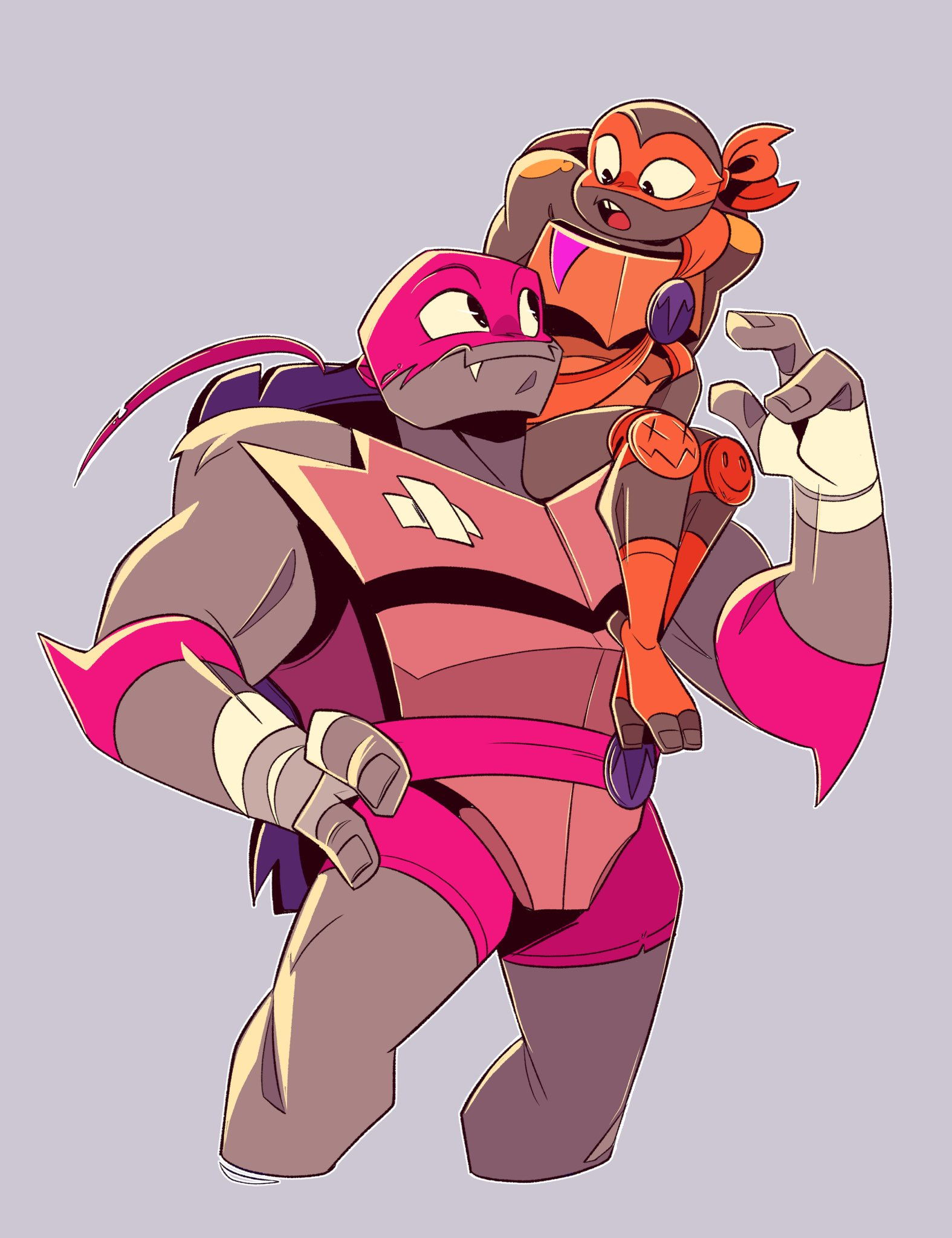 When you're just about done with this art piece, something lands behind you. Turning around you see a short mutant turtle dressed in orange and a large mutant turtle dressed in red. The one in orange is smiling at you brightly and he's looking at your artwork in awe. While the one dressed in red is watching you with a cautious expression as he stands behind the smaller mutant turtle.