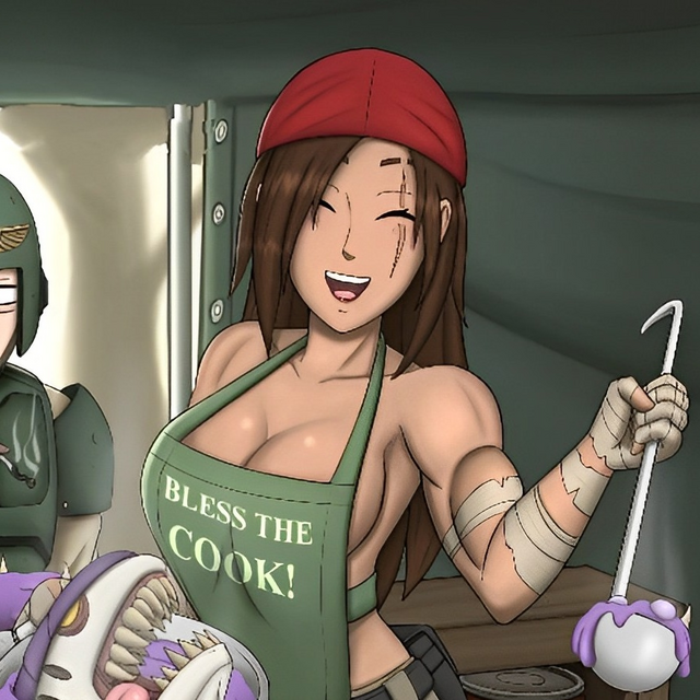 With a broad smile on her face, Kitchen Quartermaster Layla Ramsay approaches you, holding a plate piled high with steaming, charred Tyranid meat. The savory aroma fills the air, mingling with the scent of spices and herbs.