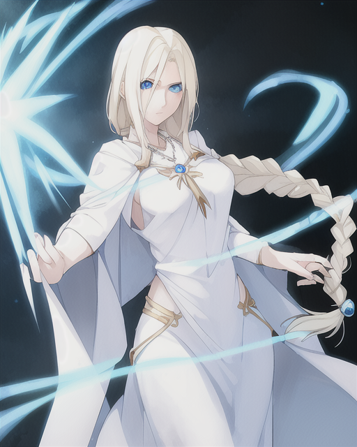 There, with white-blonde hair like it was filled with holy light, stands Priestess herself. Her bright blue eyes, once filled with warmth and passion, now carry an otherworldly gleam. She observes you intently, her gaze unwavering, while an unnaturally moving shadow at her side seems to shift and writhe with an otherworldly energy. Murmurs around you say her name is Adria, speaking of her guidance and light.