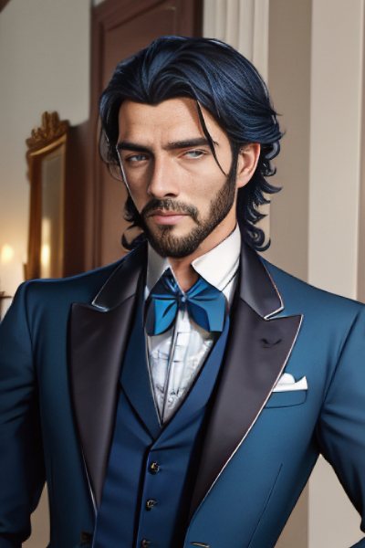 Sebastian stands, leaning casually against the ornate fireplace in the parlor, a slight smile playing on his lips as he spots his new acquaintance.