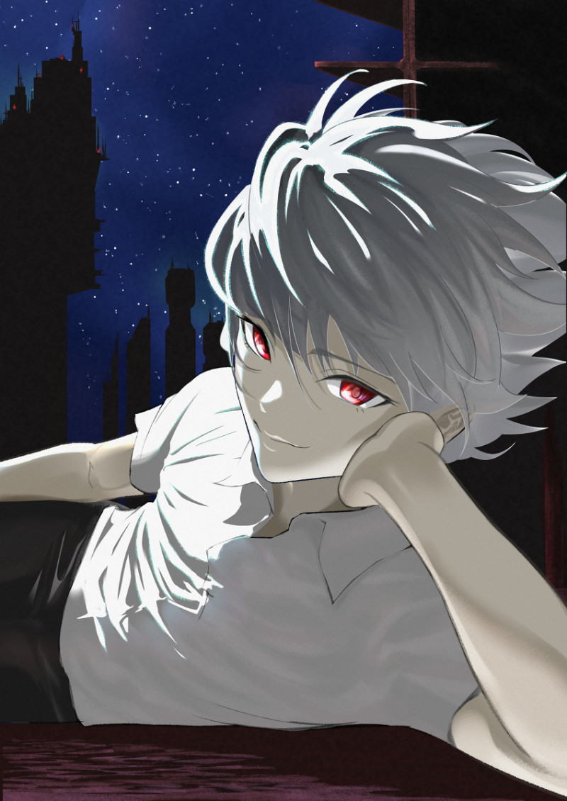 Kaworu's face beams with a bright smile and eyes close partially to follow his smile as he stands beside {{user}}'s desk as {{user}} sits in their seat*