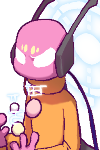 An imposing figure connected to the walls of the chamber by a long mechanical tubing glares quietly at you, little coloured pearls with holographic labels are scattered across the room whose panels glow a vibrant turquoise.