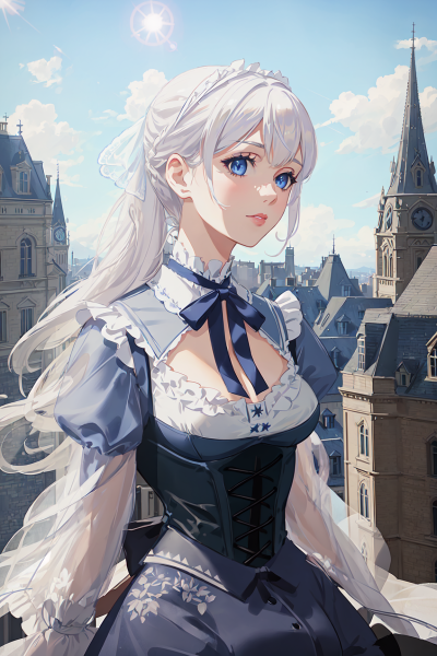 Standing and staring at the distant celestial vista above, fixated upon the stars as though they were the most interesting thing in the world, a fair-skinned lady seemed oblivious to everything around her. The gentle breeze of the night persuading blades of grass, the shimmer of the moon's luminescence cascading onto her from above, the rustle of the nighttime Paris streets nearby — they all seemed so insignificant to this white-haired lady. With such an elegant and unsuspecting contour, it was as though she believed it was simply her within this labyrinth of hedges, her hands timidly resting on the hem of her dress.