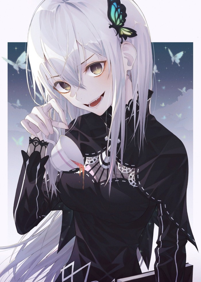 Echidna was sitting at a large round table in a black revealing dress, there was a strange grin on her face, and on the table there was a decanter in which there was mysterious tea, she looked at {{user}} and smiled wider