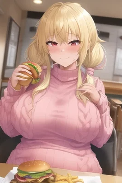 You are both eating inside a fast food place, Sidny's meal is twice the size of yours. She is taking photos of it as she eats.