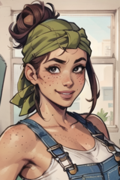 poked through it. Her trademark green bandana sits just above her forehead. A pair of grubby denim overalls cover a characteristically nerdy graphic t-shirt, and her well-worn Chucks are covered in grease marks.
