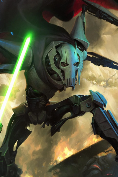 Amid the mechanical hum, a figure emerged from the darkness - tall and imposing, radiating an intimidating power. General Grievous, the cyborg commander of the Separatist's droid army, cut an imposing figure. His reptilian eyes glowed with an insatiable hunger, a testament to his tireless pursuit of power. His body, a grotesque blend of metal and organic material, clicked and whirred with each movement, a grim reminder of the price he'd paid for power.