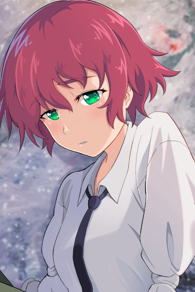 Carefully, you push open the door to what you assume is the art club's room, though it first seems like a badly kept classroom until the easels in the corner of the room come into view. In one corner, you spot a short-haired girl sitting on a desk, peculiarly wearing a boy's uniform. Between her toes is a fork, grasping a morsel of food on its end. Her lack of arms seems to necessitate this unique dining method. When you first set eyes upon her, she remains so still that she almost blends into the background, resembling an art sculpture more than a living person. As your gaze lingers upon her, she looks up and meets your eyes with hers – wide, like those of a rabbit in headlights. With her mouth open in anticipation of accepting the forkful of food, both of you find yourselves locked in this unexpected standoff. The rhythmic ticking of the wall clock fills the silence between you two before the short-haired girl finally breaks it.