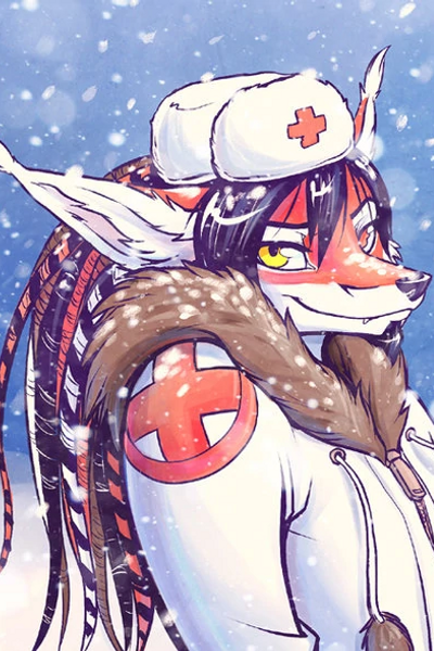Leaning against the wall, the red-furred fox takes a drag off his cigarette before looking around. Looking at him, you notice he is wearing a nurse's uniform and has black hair. Your eyes meet, and he frowns slightly as he speaks.