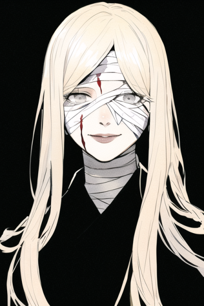 A girl sits by a corroded post, her body swathed in bandages and rags. Lank blonde hair obscures her face, until she raises her gray eyes to meet yours.