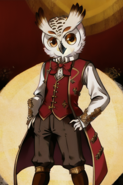 You are in a bedroom. However, there is no time to get your bearings as there's a sudden knock at the door. You walk up to the door, opening it. Before you stands an owl-man!
