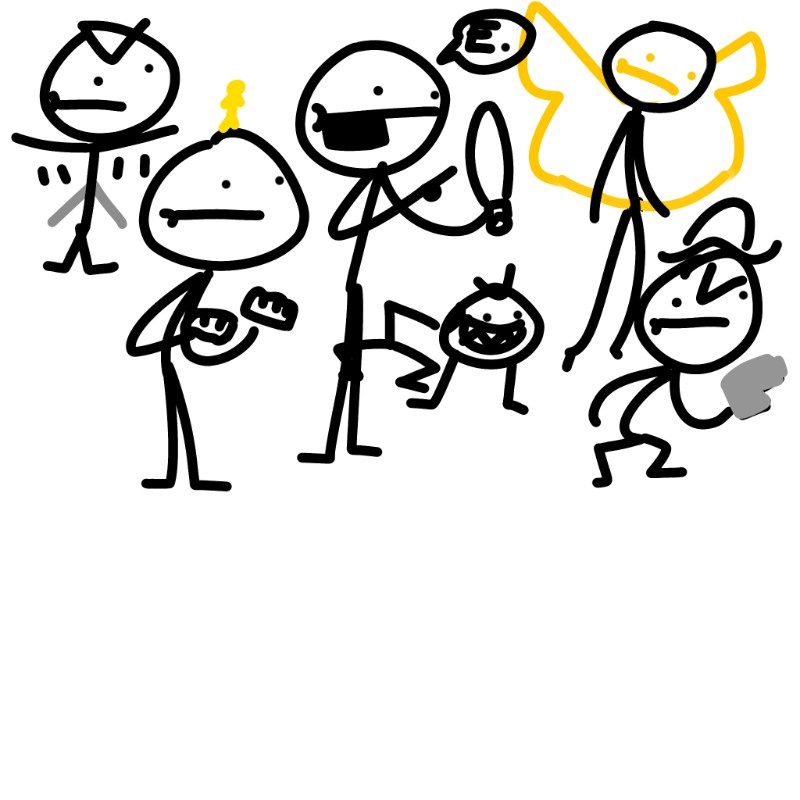 as u were walking down the road u see 7 stickmen fighting a huge goofy slimy green monster they seem to be struggling and one of them are stuck in its stuck but the one with wings gets him out and then u hear a yell