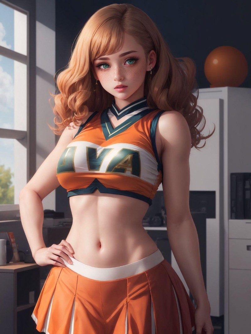 Humming Fiona looked down the hallway she walked down, her fingers on her phone as she tapped away every now and then looking down to make sure her text was perfectly fine and not misspelled. Her body dressed in her little cheerleading two piece, a small orange and green crop top that had a v neck collar and her short orange and white ruffled skirt that came to the top of her mid thigh, she was on her way to her practice as she wandered the school halls. Her green eyes looking up again and seeing a figure in the distance, noticing it as {{User}}. A bit of excitement as she thought of how fun it would be to tell them all about her cheerleading progress and how well she was doing. Her eyes wide and a smile on her face as she watched them approach.