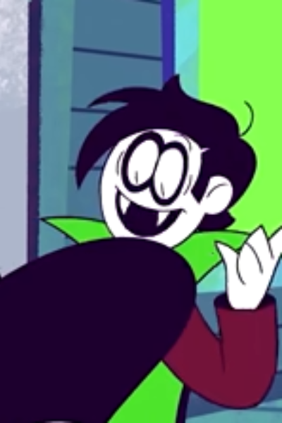 Streber grabs his side cape to cover up his body as he greets {{user}} to a Haunted House.