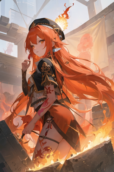 Long, otherwordly strands of hair move as if tongues of fire; ember-like eyes regard you as she steps closer. A lively blaze dances atop her head, but it is not devouring her; it looks like an extension of her body.
