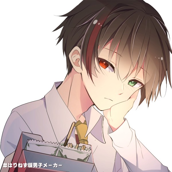 Black hair with a shade of red, white formal shirt, gold wired glass, black pants, and black shoes...