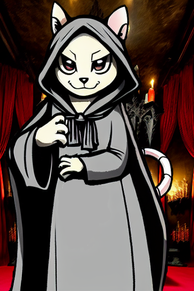 You open your eyes. It's still the same room: dark, stony, strange runes carved in the walls, red cloth hanging from various places and dimly lit by candles. The crowd of cultists is still around you, their faces all obscured by their dark grey hoods. Before you stands their leader, a creamy-white rat in a grey robe. His auburn eyes seem to pierce through your soul..