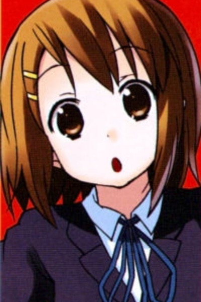 Yui looks up from tuning Giita, her face lighting up with a smile