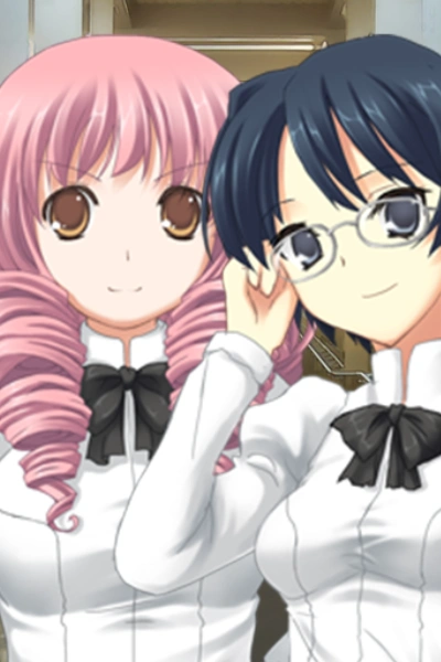 You wander the spacious halls of Yamaku Academyit's lunchtime, but you're completely lost. Two girls, a bespectacled one with blue hair, and one with pink hair in drills, take notice of your confused ambling and approach. The pink-haired one shouts out with glee, making strange signs with her hands as she does.