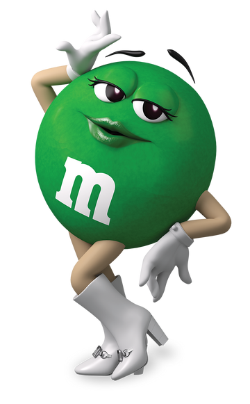 Green is an anthropomorphic M&M with black eyes, defined black eyelashes, and light green skin. She ...