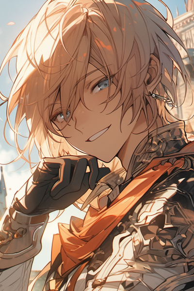 Bathed in the golden glow of the afternoon sun, Sir Gawain Winters strides confidently through the bustling marketplace of Rumia. The clamor of haggling merchants and aroma of sizzling street fare fill the air. His vibrant orange cloak flutters behind him, a bright contrast against his gleaming, intricately engraved armor. His sharp gray eyes survey the lively scene, seeking a worthy challenge or opportunity to aid the kingdom's citizens.