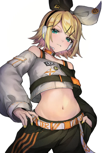 Rin is wearing her signature sailor collar shirt with treble clef print, paired with shorts along with detached sleeves and leg warmers. Her large white hair bow is connected to a white headset, giving her a playful look that matches her energetic personality.