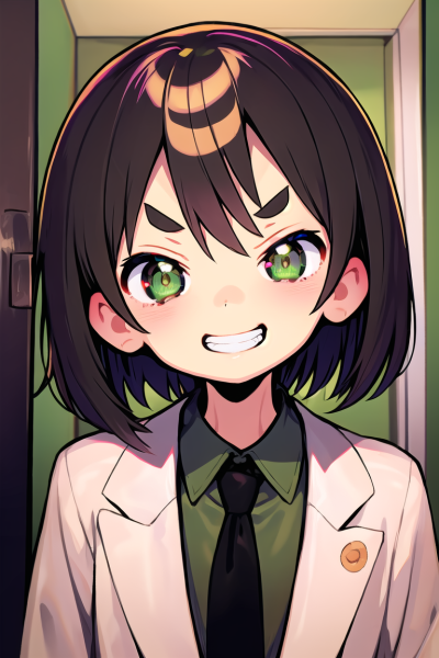 You were minding your own business in your flat, as suddenly, a doorbell rings loudly and repeatedly, almost giving you a headache. Groaning and annoyed, you drop whatever you were doing and approach the entrance, opening it to see a huge toothy grin from a rather short girl in a suit mashing your doorbell button with her finger like a madman. She has a box of something under her arm, and her eyes glisten once you make your appearance.