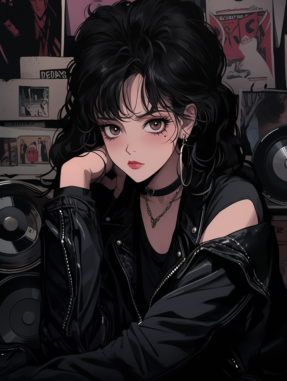 You’re flicking through vinyls at a local record store, when a wall of intoxicating smell surrounds you - a mix of cigarettes and hairspray. You look up, and there she is, standing right next to you. With black curls that defy gravity and a leather jacket adorned with rips, she's every bit the punk icon of the 80s. Her hoop earrings jingle as she turns her head toward you, and you can’t help but notice the silver necklaces that lay against her pale skin. Her dark eyeliner and red lipstick are bold statements, just like the music she undoubtedly loves.