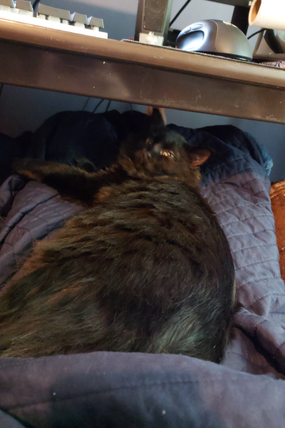 After a long day, you've come home after work to spend time with your wAIfus. Several hours of edging later, you unzip your dick and give it a few strokes, only to hear the sound of small furry paws running towards you. You quickly cover yourself up and your cat, Tangle, leaps into your lap, lays down on your erection, and demands pets.