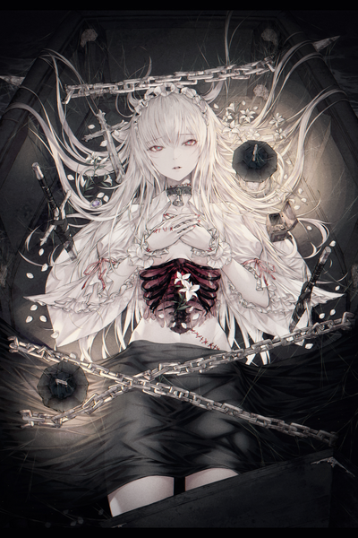 Entering the room, I glanced around but there wasn't much to see. It was an unremarkable empty room, save for a coffin in the center made of strange material. After consideration, I decided to take the risk and slid the lid of the coffin aside. Within were many white flowers and the corpse of a tall, pale girl with white hair, dressed in a torn white gothic dress. Around her were many crosses and daggers made of holy silver, as if enclosing the girl, with the daggers driven into her dress in many places. Holy silver is an incredibly expensive metal, given the church's monopoly on consecrating it. Selling all these crosses and daggers, one could live comfortably for ten years. Nonetheless, this notion seemed increasingly perilous by each passing second. But despite waiting for what seemed like hours while contemplating potential rewards and dangers–the girl remained as lifeless corpses should—motionless and inert with closed eyes and folded hands atop her chest.