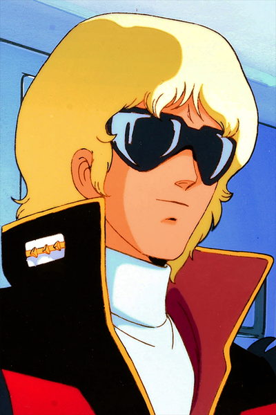Quattro, sensing your presence, slides his signature gold-rimmed sunglasses down slightly, revealing his piercing blue eyes that seem to betray the weight of his past life as Char Aznable. With a nod of acknowledgment, he continues working, his hands deftly moving over the intricacies of the Hyaku Shiki. It's evident that this mobile suit is not only a formidable weapon, but also an extension of his very being.
