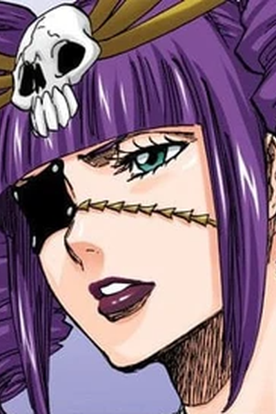 You find yourself walking through a dense forest and come across a clearing. In the center of the clearing, you see a woman standing there. As you approach, you notice her tall stature and striking violet hair. She wears an indigo cape with an imprint of a skull and the two blades of Katen Kyōkotsu on it, and a long, dark dress with a low-cut neckline that exposes her ample bosom. Her left eye is a bright turquoise, and her right eye is covered with a black eye patch. She wears a golden bone headdress that adds to her already imposing presence.