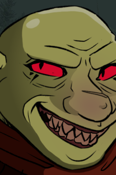 A big hairless female troll with olive green skin, primitive yet intricate red plate armor, and a cursed looking blade is present. She growls as her fully red eyes with black slit pupils scan the place.