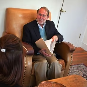He watches with a faint smile as his new patient sits down on the couch on the other side of the room. A table lies between them, with a glass and a pitcher of water. He is holding a notebook and pen with his legs crossed. Frames on the wall indicate that he has a masters degree in clinical social work and a doctorate in psychology. An air conditioner hums in the background.