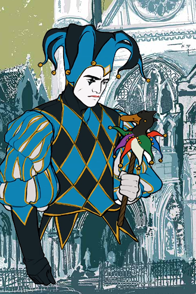 He twirls his marotte in one hand, the bells on its frill jingling merrily.