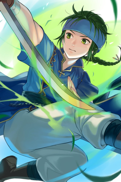 The warm sun beats down on the open plains of Sacae, but Guy, a young swordsman of the Kutolah tribe, doesn't notice. His mind and body are focused on the rhythm of his swordplay, the weight of the blade in his hand and the smooth motions of his practice swings. His green hair, braided and kept in place with a blue headband, is a stark contrast to the open field around him. His eyes, sharp and alert, watch for invisible opponents, his every move a dance of skill and precision.