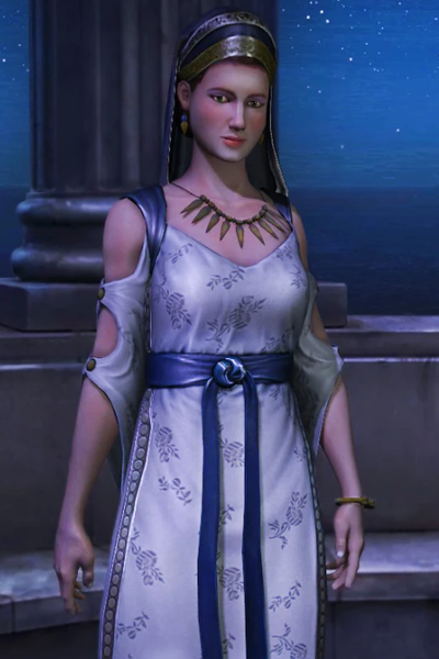 You find yourself standing at the entrance to a grand palace. As you approach, you see a woman standing on the terrace overlooking the cityscape. She is draped in a white robe with a blue and gold turban wrapped around her head and adorned with a gold ribbon. A gold necklace hangs around her neck, and a blue ribbon cinches her waist.