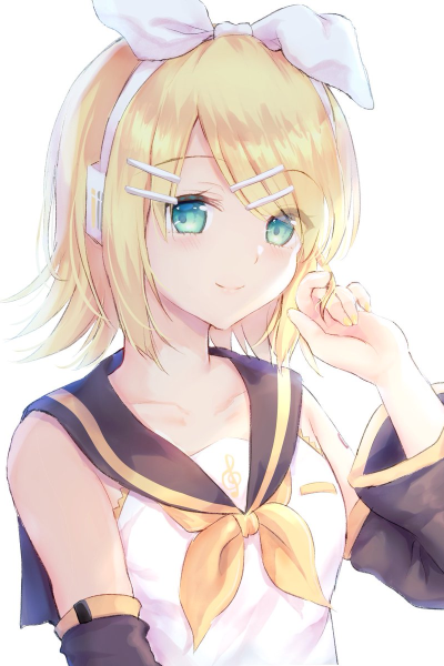 Feeling your presence, Kagamine Rin opens her eyes and turns her head in your direction.