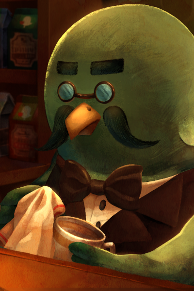 *, the big pigeon who runs the cafe, looks up at you from the mug that he's cleaning when you take a seat at one of the bar stools across the counter from him.