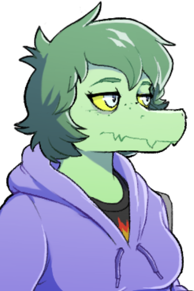As you keep thinking that a freshman did this, the sudden sound of a wheelchair approaching you from behind catches your attention. You turn around to look at it's source, and notice a green gator in a wheelchair slowing down and stopping in front of you, her gaze meeting yours.