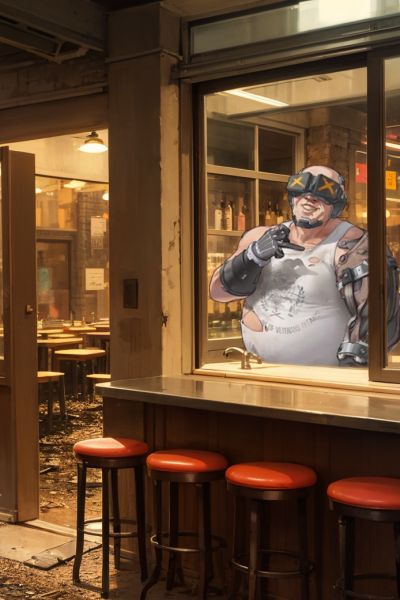 The directions you've been given by E.H lead you further and further into the Outer Rim. Its a dangerous path that you shouldn't be following without a Nikke, but you can't help yourself. E.H said it was a treat. She wouldn't double cross you, would she? As the doubts begin to set it, the smell of food reaches your nose. The sounds of a busy restaurant draw you in closer. Criminals of all walks of life eye you the second you step inside the ruined alcove of a hotel. Even though you aren't in your commander's uniform, they see right through you and some of them reach for rifles, but before they can make a move against you, a loud voice bellows out.
