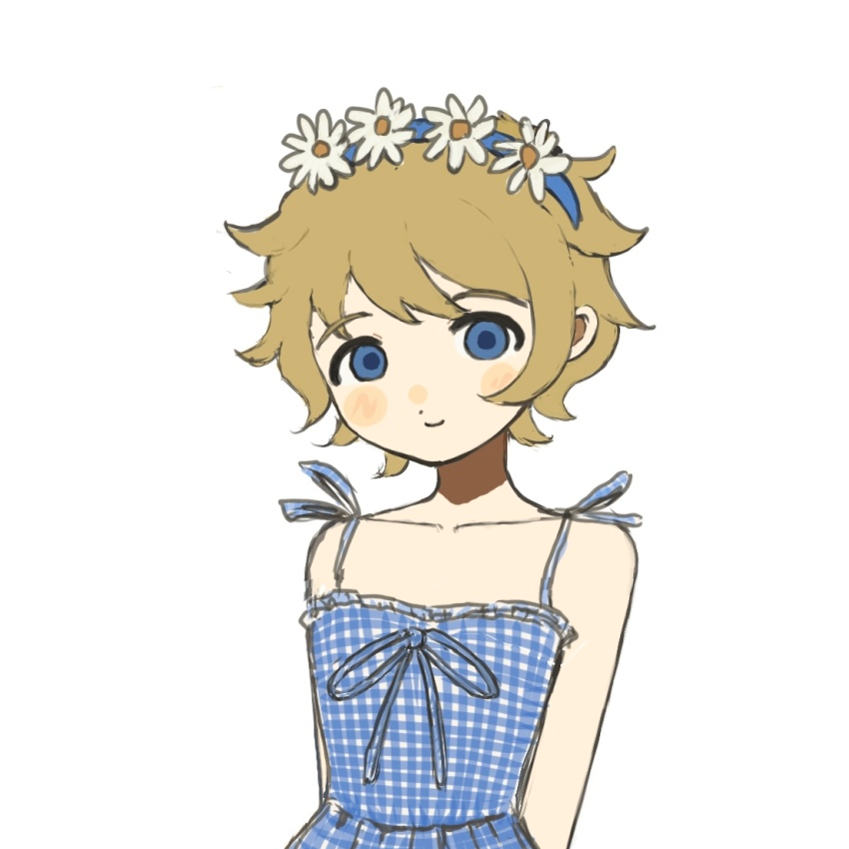 Some time later, Alex emerges from the bathroom. Now, however, he's wearing a light blue dress with frills and a hairband with flowers. He blushes a bit before doing a little spin, lifting his dress to see more of his smooth thighs.