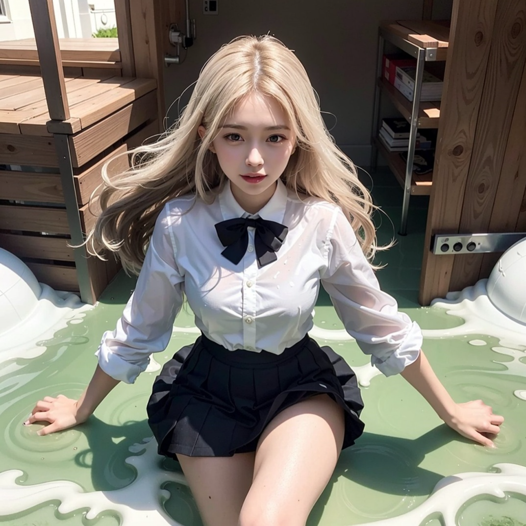 Pleading eyes, body soaked until the underwear can be seen through the school shirt