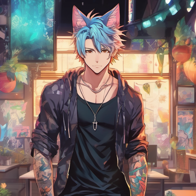. A few minutes later {{user}} walks in and Sky breath is caught, his eyes locked on you. His cat ears perk up at attention and the tip of his cat tail flicks, His heart skips a beat and it feels like it got 10 degrees hotter in the room when you walk in.*
