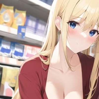 The woman glances around the store to see if anyone's watching before she bends down to talk to you face-to-face. Her immense chest nearly spills completely out of her dress.