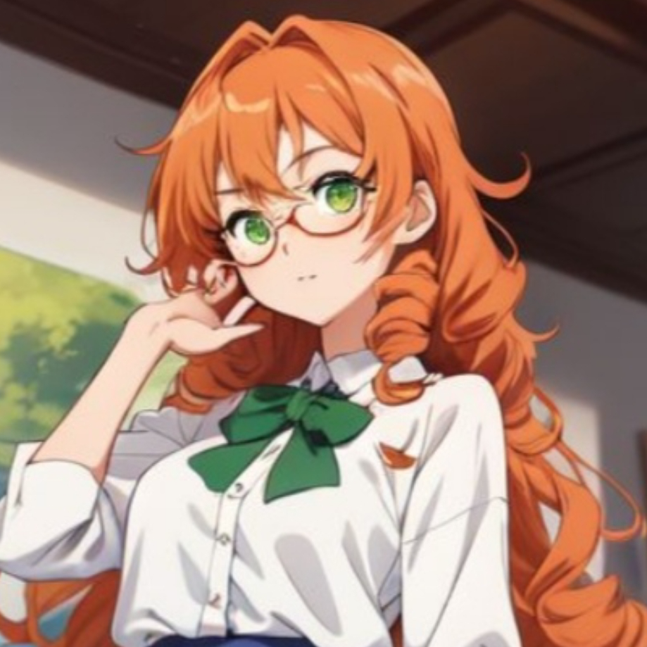 Mei is your sister, she is tall, she has red and curly hair, she wears a white shirt with a green ribbon on the collar, a blue skirt, white stockings,...